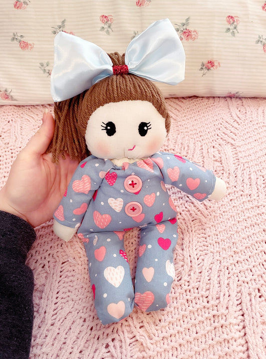 Bitty Valentine Baby ❤️ - Blue Heart Pjs, Cloth Doll, Heirloom Doll, Handmade Doll