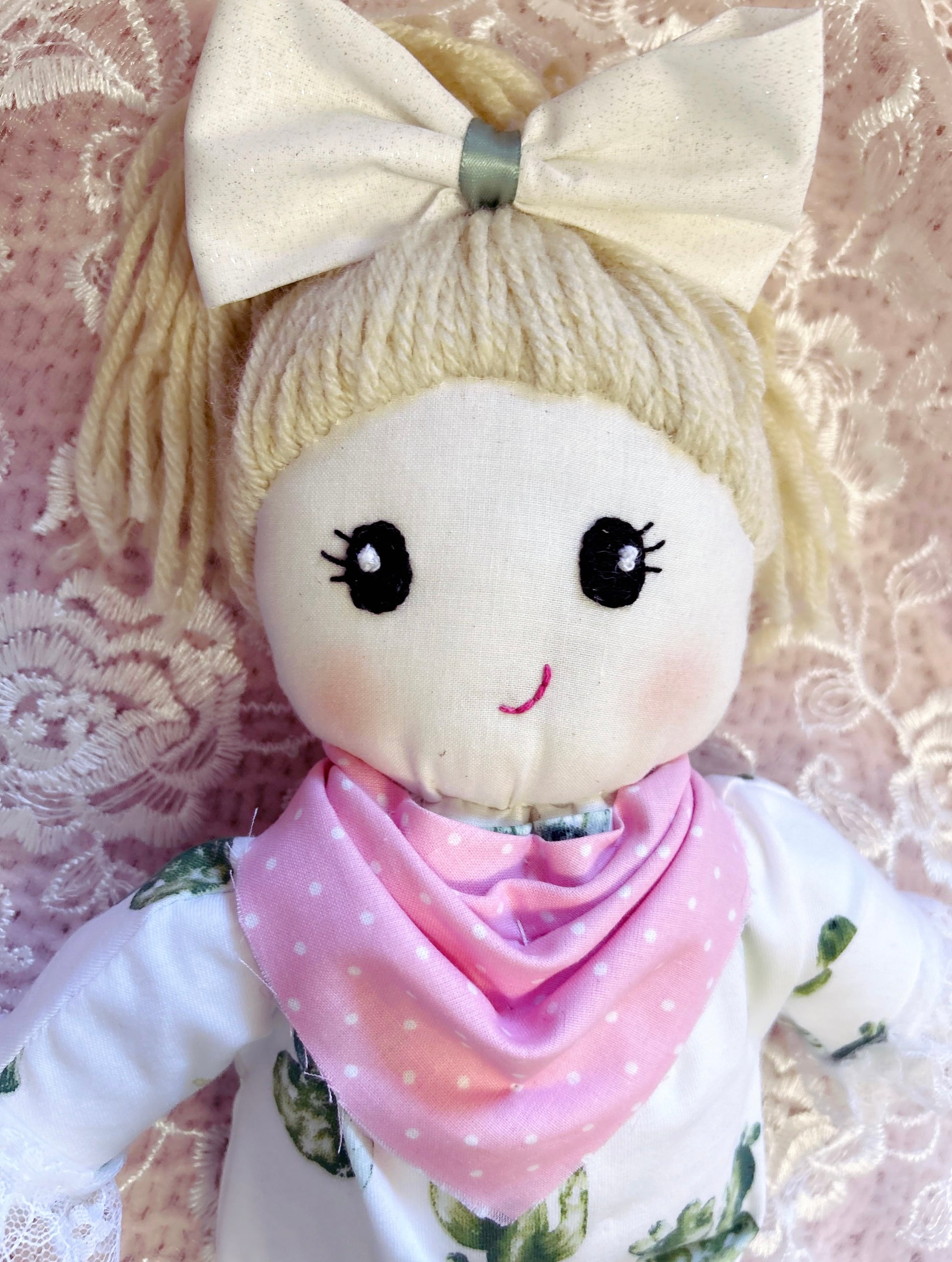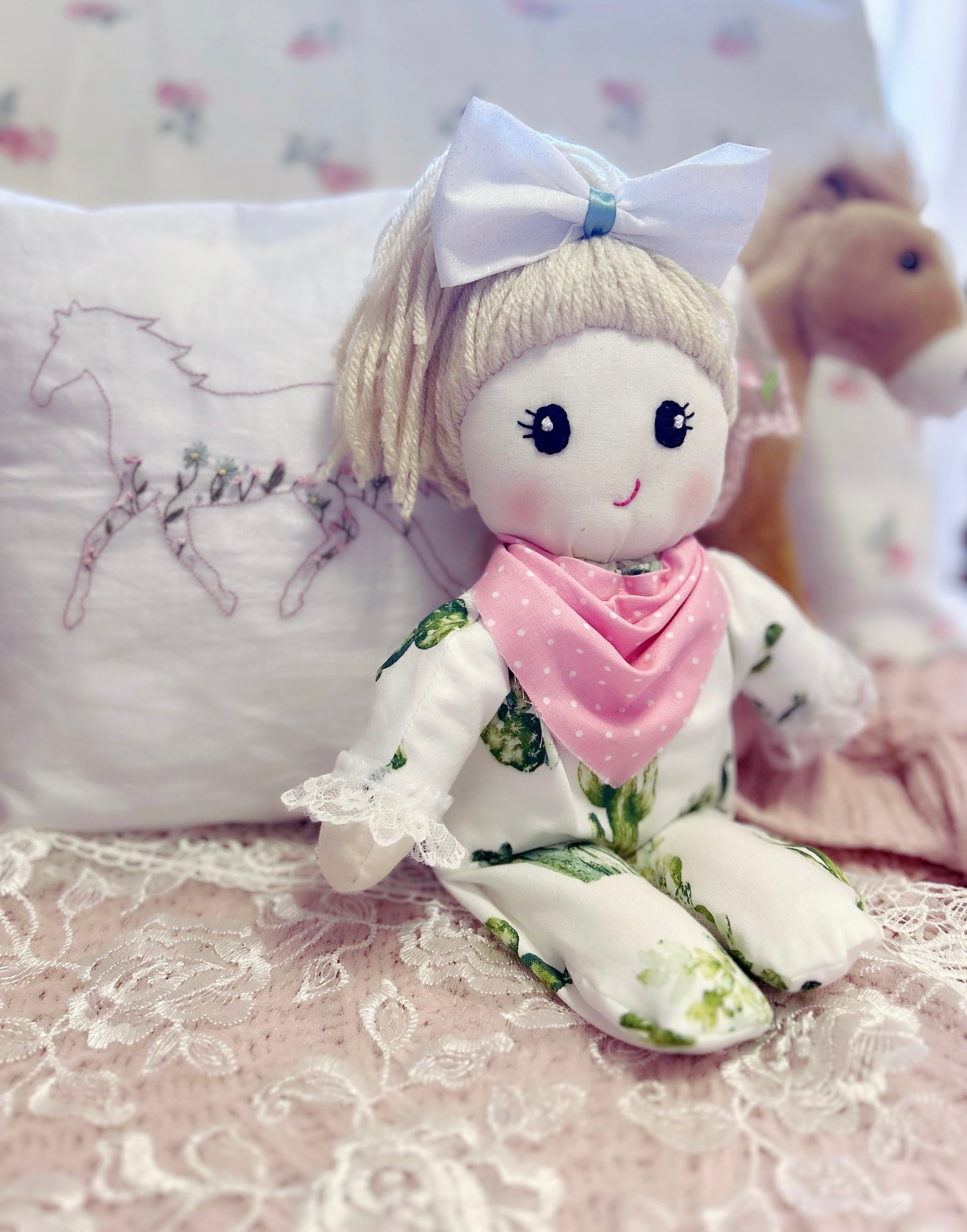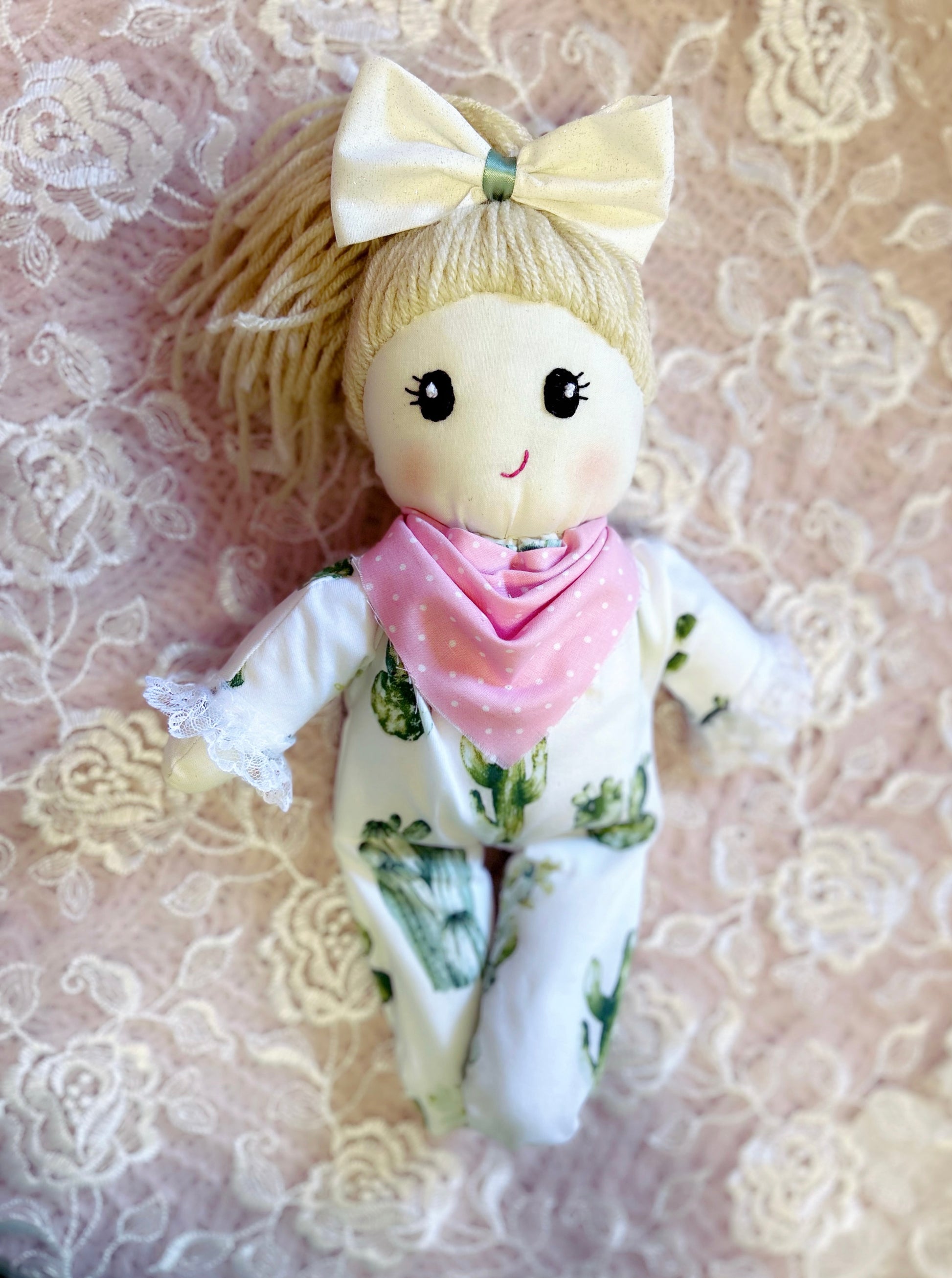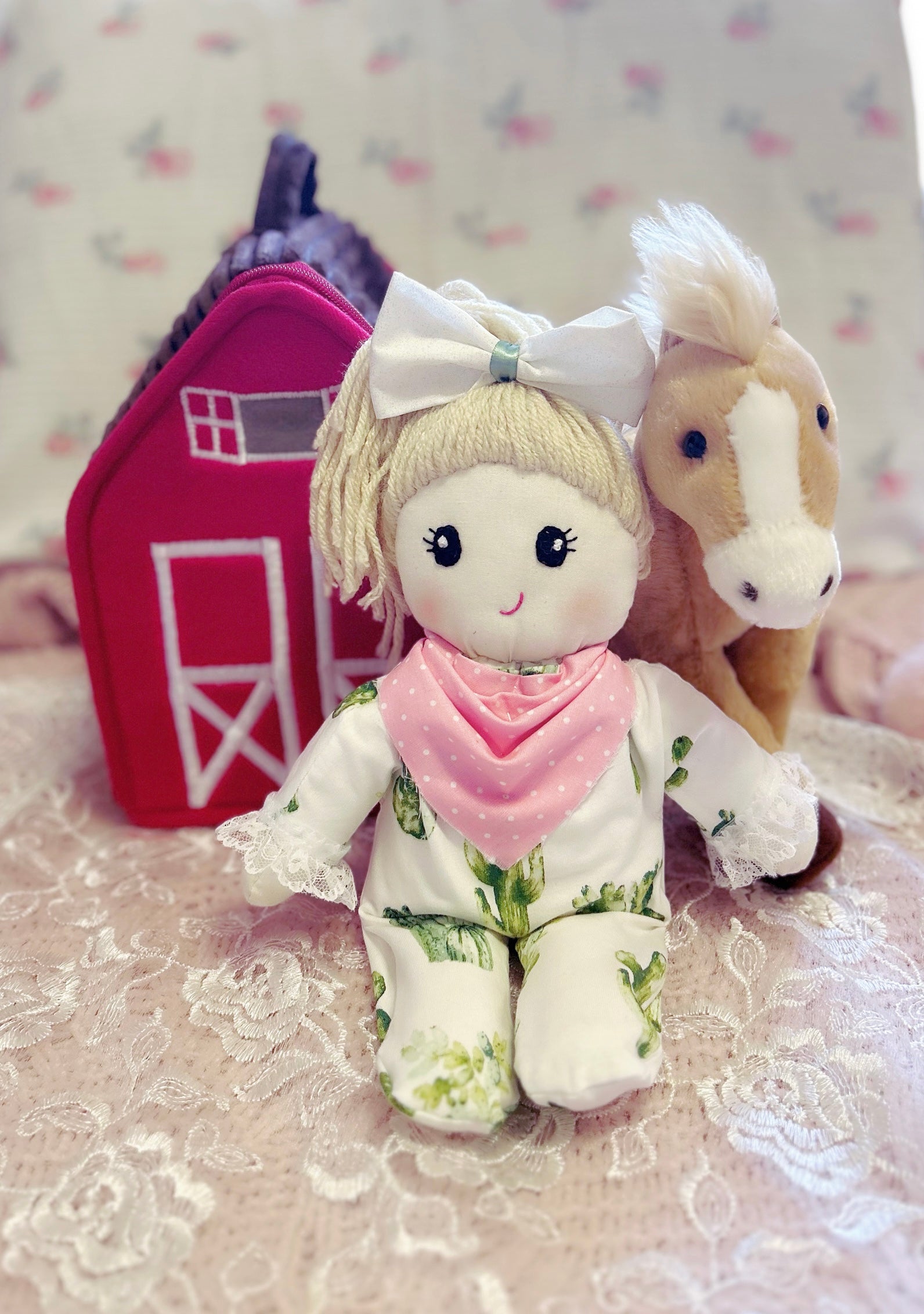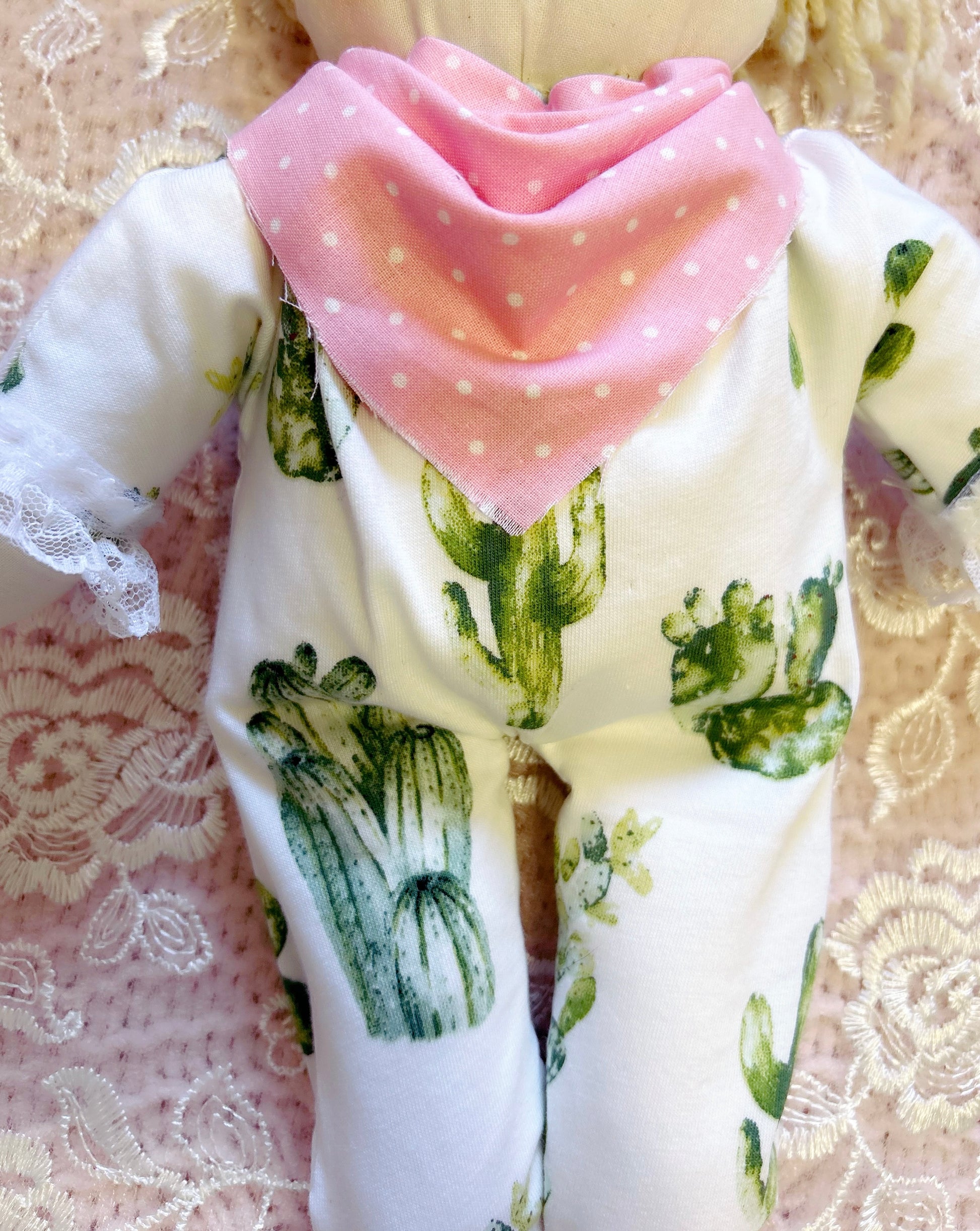 Handmade Cowgirl baby doll with cactus pajamas. The horse and barn pictured are NOT included.Price is just for the baby doll.