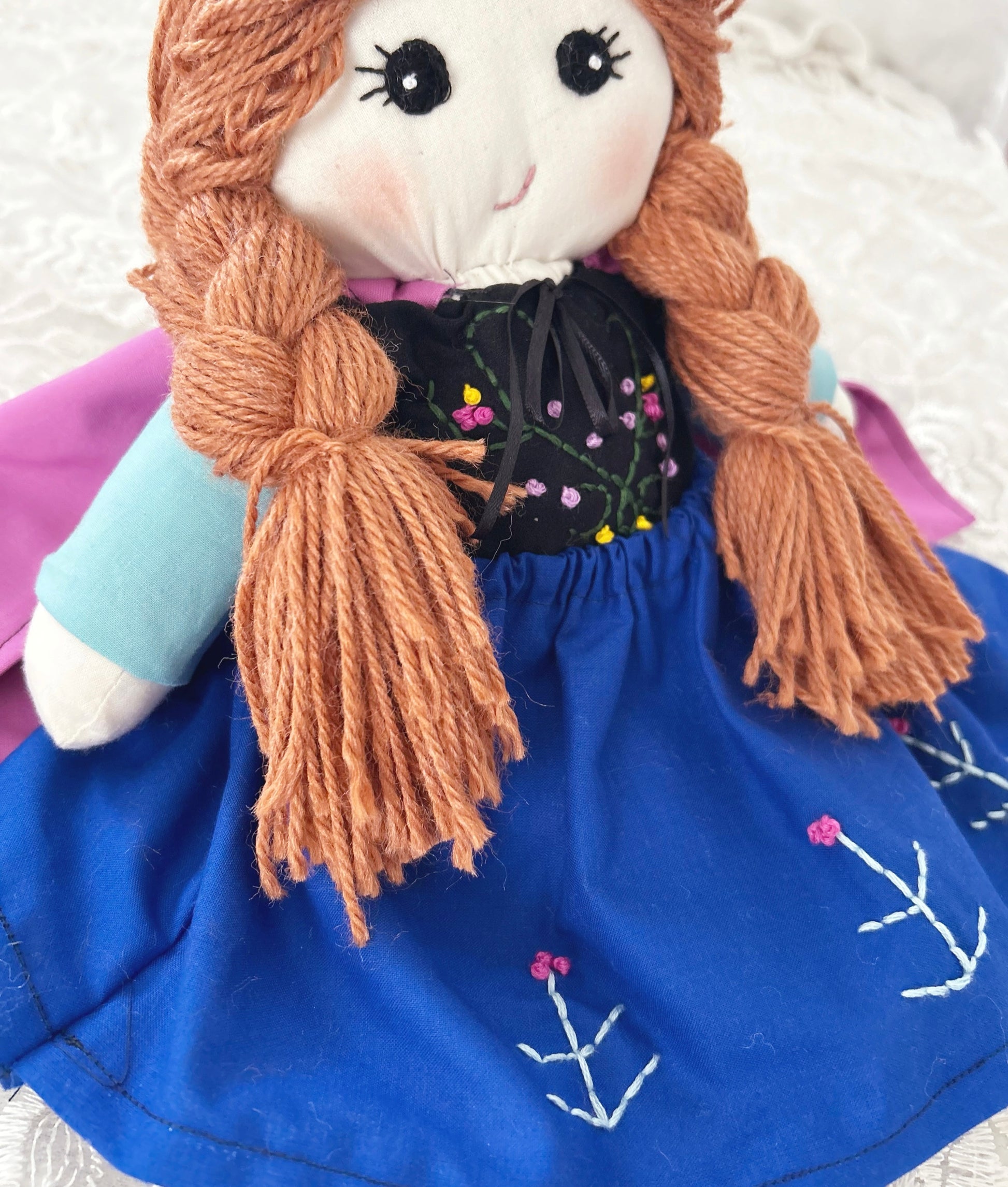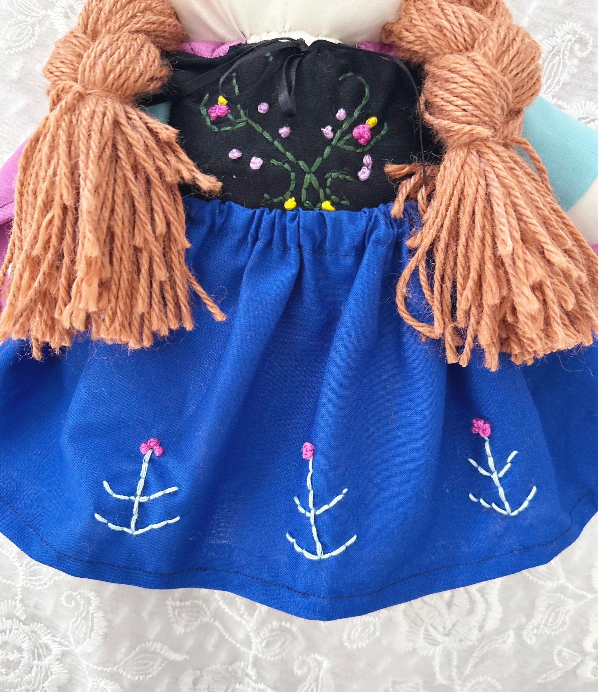 Hand sewn eyes, mouth, and flowers on her dress.