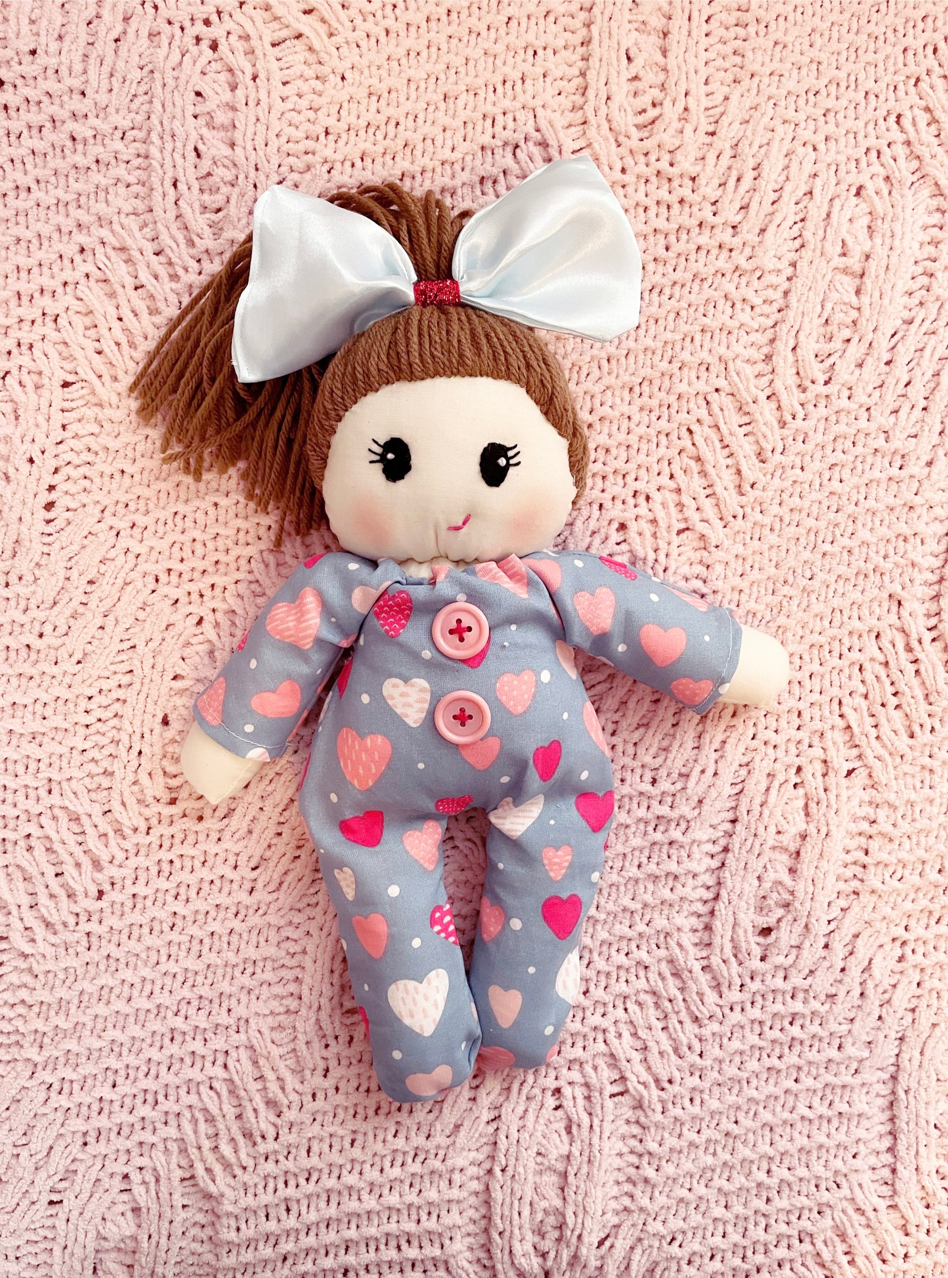 Bitty Valentine Baby ❤️ - Blue Heart Pjs, Cloth Doll, Heirloom Doll, Handmade Doll